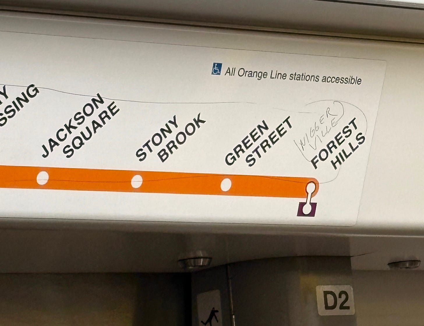 Riding the Orange Line this past summer on my way home, to Forest Hills, I looked up at the transit map and saw the entire line southwest of Mass Ave (covering the Roxbury and Jamaica Plain neighborhoods, home to many Black/Caribbean/East African communities), encircled with pen and lazily re-christened, “NIGGERVILLE.”